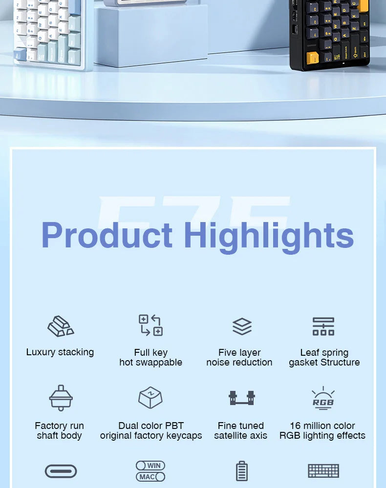 AULA F75 2.4G Wireless/Bluetooth/Wired Gaming Mechanical Keyboard RGB Customized 75% Layout OEM Profile Gasket Structure